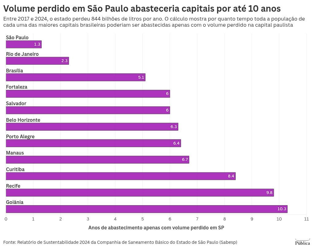 Foram 19 trilhões de litros de água perdidos em São Paulo entre 2017 e 2024, 844 bilhões de litros por ano. Em outras palavras, apenas com o que vem sendo perdido para o ralo, seria possível manter toda a população da capital paulista abastecida, sem interrupções – com cada habitante mantendo o gasto médio diário já praticado, de 150 litros.