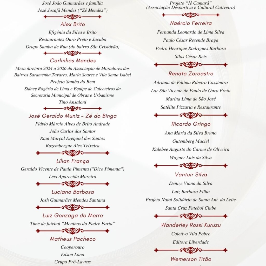A lista de 2025 reúne 44 nomes que atravessam diferentes campos de atuação: da economia solidária ao esporte de várzea, da assistência social às manifestações culturais. Entre os homenageados estão o Lar São Vicente de Paulo de Ouro Preto, o Santa Cruz Futebol Clube, o Coletivo Vila Pobre, o Projeto Samba do Bem, o Projeto “Iê Camará”, o Projeto Natal Solidário de Santo Antônio do Leite, o Grupo Samba de Rua do bairro São Cristóvão, o Time de futebol Meninos do Padre Faria e o Mestrado Profissional em Ensino de Geografia do IFMG – campus Ouro Preto.