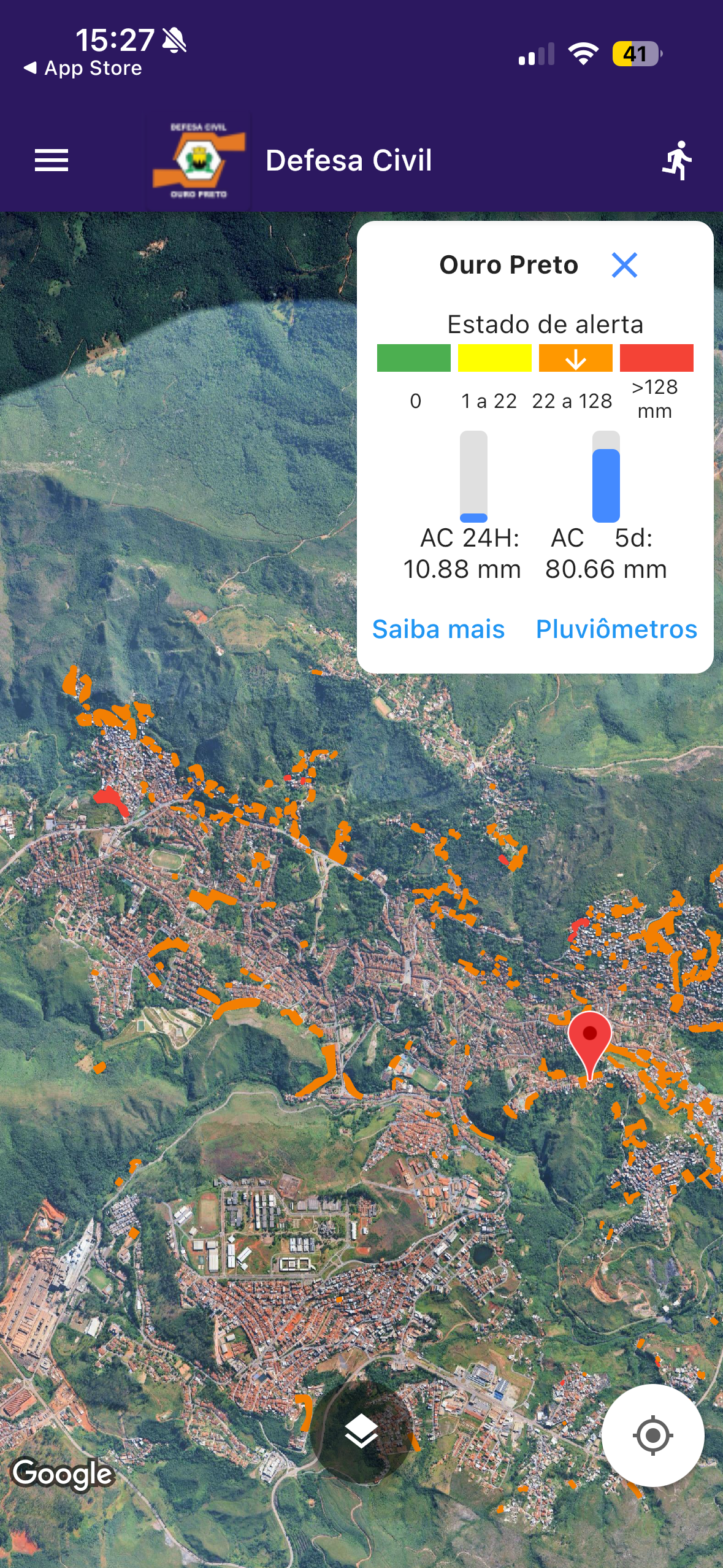 O aplicativo da Defesa Civil de Ouro Preto (Android e iOS) concentra, em tempo real: