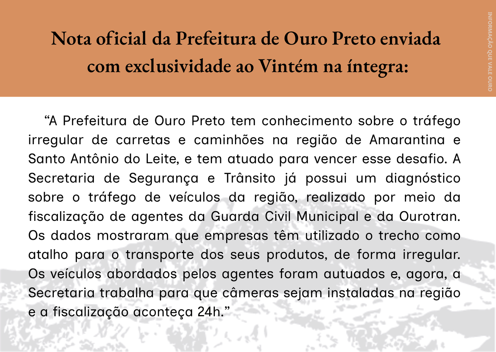 Enquanto isso, a Secretaria de Segurança e Trânsito de Ouro Preto trabalha para instalar câmeras na região, permitindo fiscalização 24 horas do tráfego irregular. Dados levantados pela Guarda Civil Municipal e pela Ourotran mostram que mais empresas têm utilizado o trecho e o acesso pelo distrito de Santo Antônio do Leite como atalho para transporte de produtos, sem autorização.