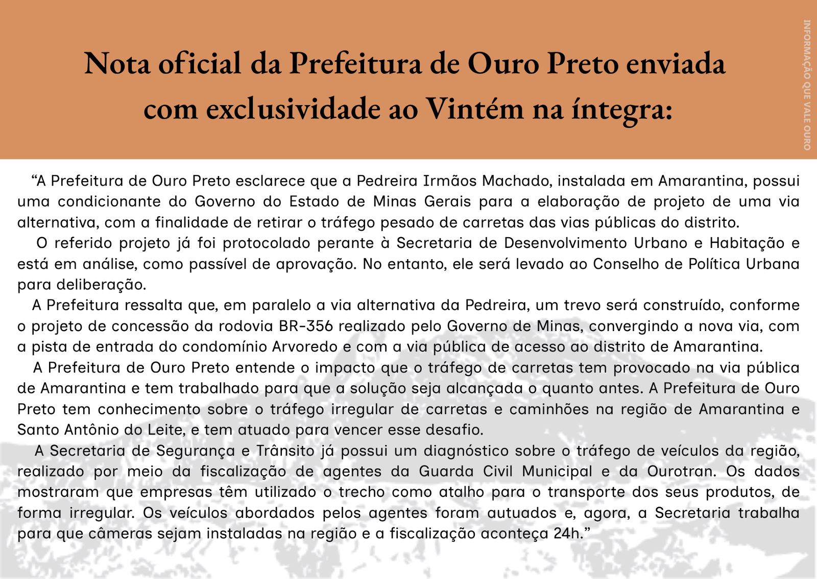 A Prefeitura de Ouro Preto, por sua vez, afirma que o projeto “já foi protocolado perante à Secretaria de Desenvolvimento Urbano e Habitação e está em análise, como passível de aprovação.” O município informa que o projeto será levado ao Conselho de Política Urbana para deliberação e reconhece “o impacto que o tráfego de carretas tem provocado na via pública de Amarantina”.