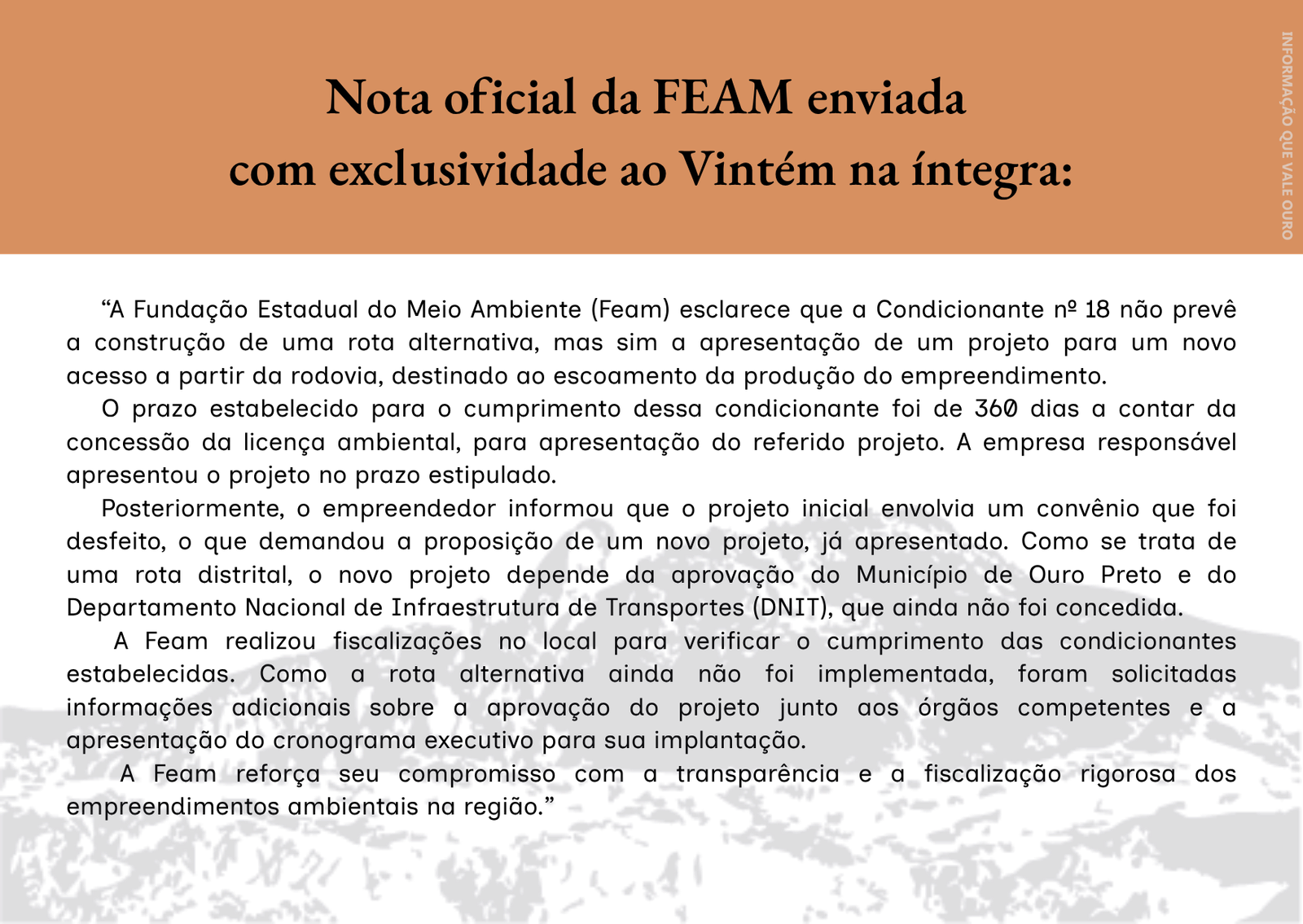 A chamada Condicionante 18 foi estabelecida em 2019, quando a Pedreira Irmãos Machado obteve sua licença ambiental. O texto previa a apresentação de um projeto para novo acesso a partir da rodovia BR-356, destinado exclusivamente ao escoamento da produção do empreendimento, com prazo de 360 dias.