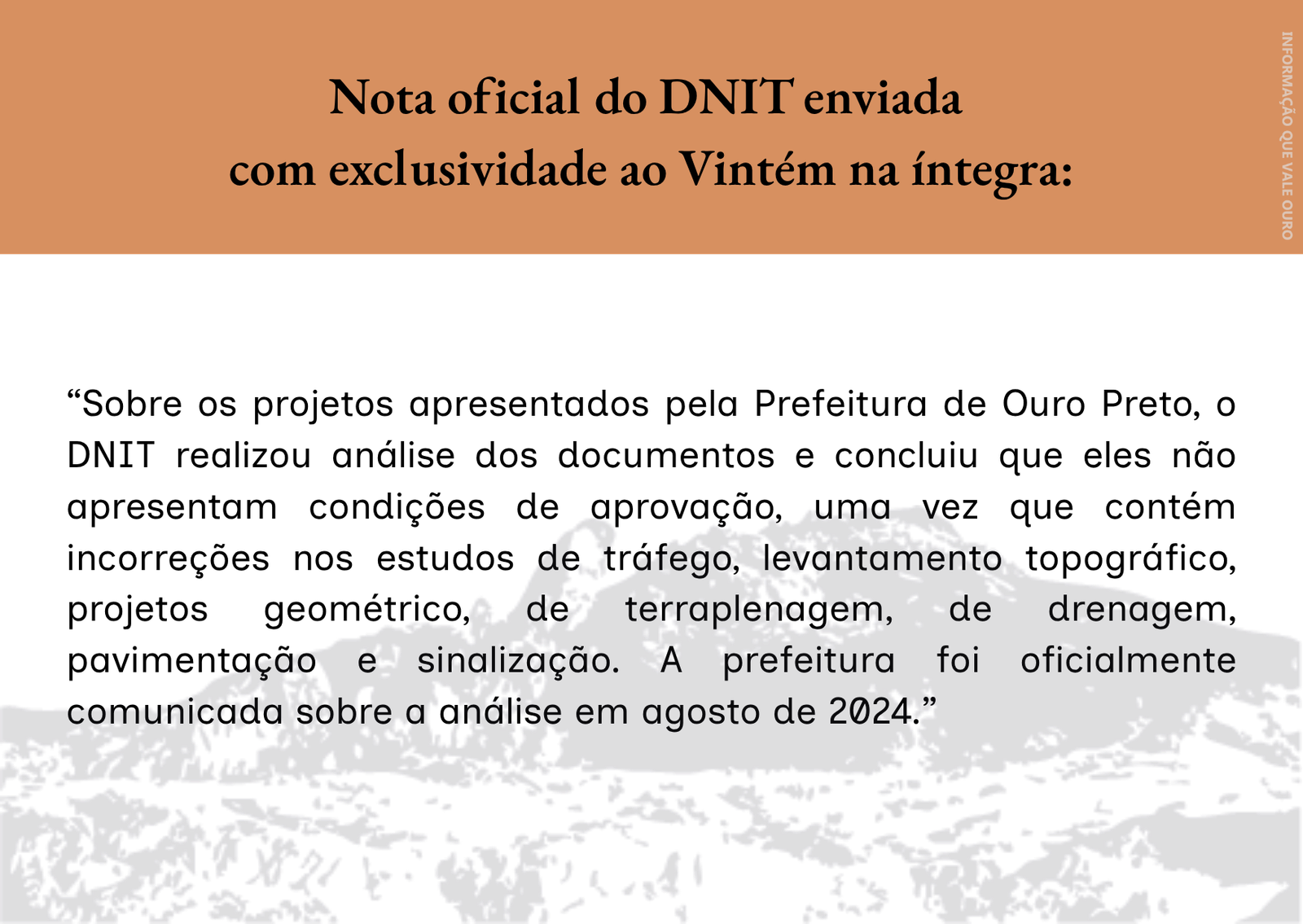 O DNIT, responsável pela gestão da BR-356 até a privatização, deixou claro em agosto de 2024 que os projetos apresentados pela Prefeitura de Ouro Preto “não apresentam condições de aprovação, uma vez que contêm incorreções nos estudos de tráfego, levantamento topográfico, projetos geométrico, de terraplenagem, de drenagem, pavimentação e sinalização.” A Prefeitura foi oficialmente comunicada.