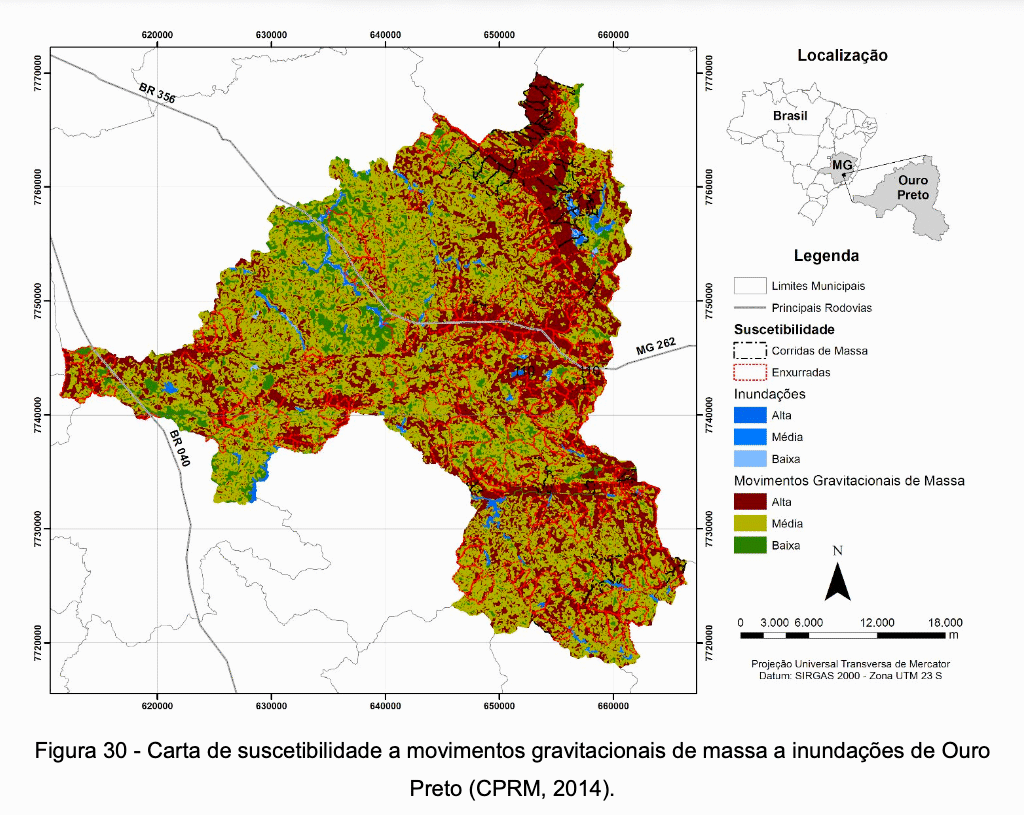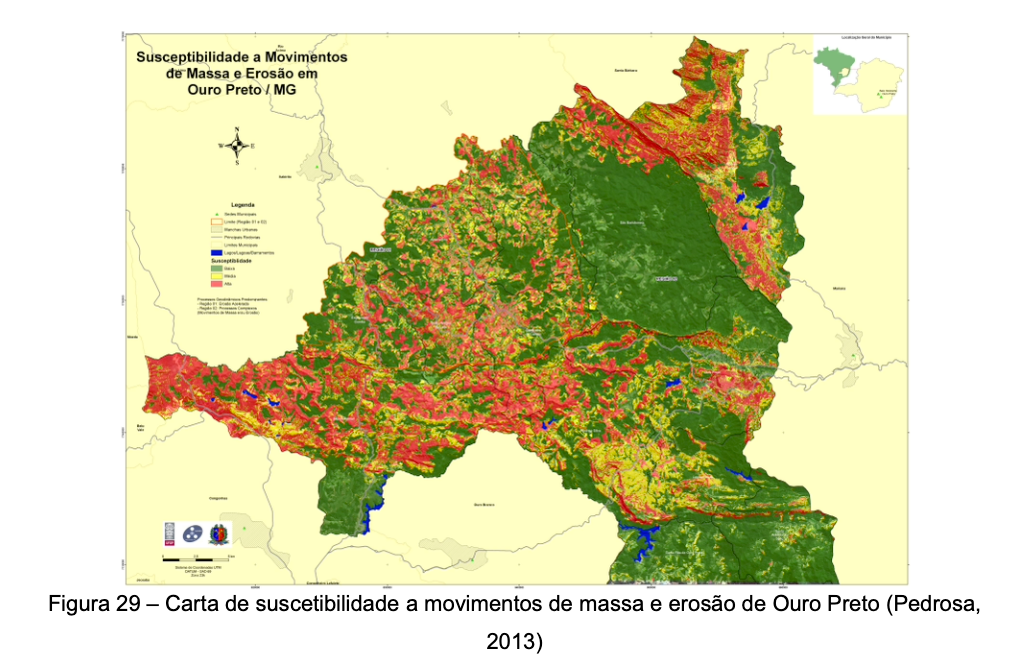 Esse documento é o Plano Municipal de Redução de Riscos (PMRR), concluído em 2023, resultado de uma parceria entre a Universidade Federal de Viçosa (UFV), a Coordenação Geral de Prevenção e Projetos Estratégicos do Ministério do Desenvolvimento Regional, a UFOP e a Defesa Civil Municipal. O estudo cobre todo o território de 1.245 km², emprega metodologias avançadas, sobrevoos com drones, análises geotécnicas e três décadas de registros de movimentos de massa. É, hoje, a radiografia mais detalhada já produzida sobre a vulnerabilidade de Ouro Preto.